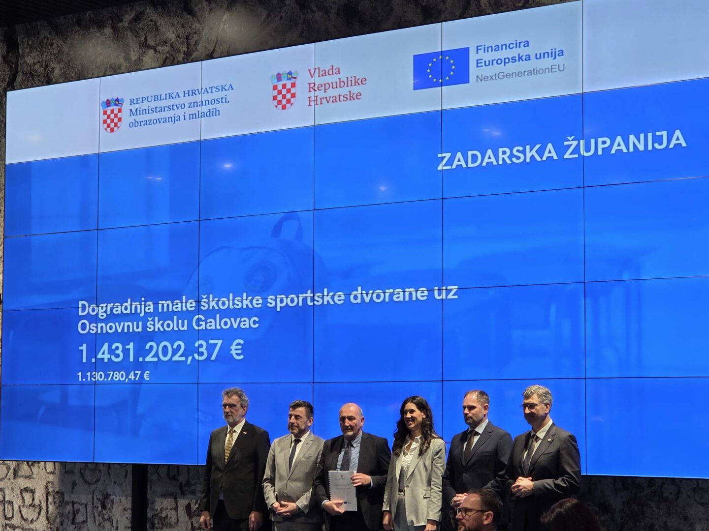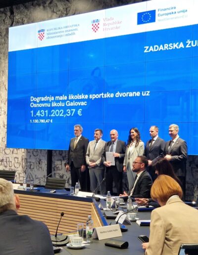 Dana 26. veljače 2026. godine ravnatelj Osnovne škole Galovac Josip Lučić sudjelovao je na svečanoj dodjeli ugovora u Nacionalnoj i sveučilišnoj knjižnici u Zagrebu gdje je s Ministarstvom znanosti, obrazovanja i mladih potpisan ugovor o dodjeli bespovratnih sredstava Osnovnoj školi Galovac. Radi se o projektu dogradnje male školske sportske dvorane uz Osnovnu školu Galovac ukupne vrijednosti 1.431.202,37 €. Od tog iznosa, bespovratna sredstva iznose 1.130.780,47 € dok će preostali dio osigurati prijavitelj i partner u ovom projektu – Zadarska županija i Općina Galovac.