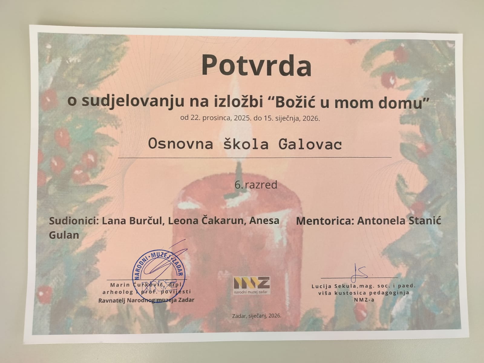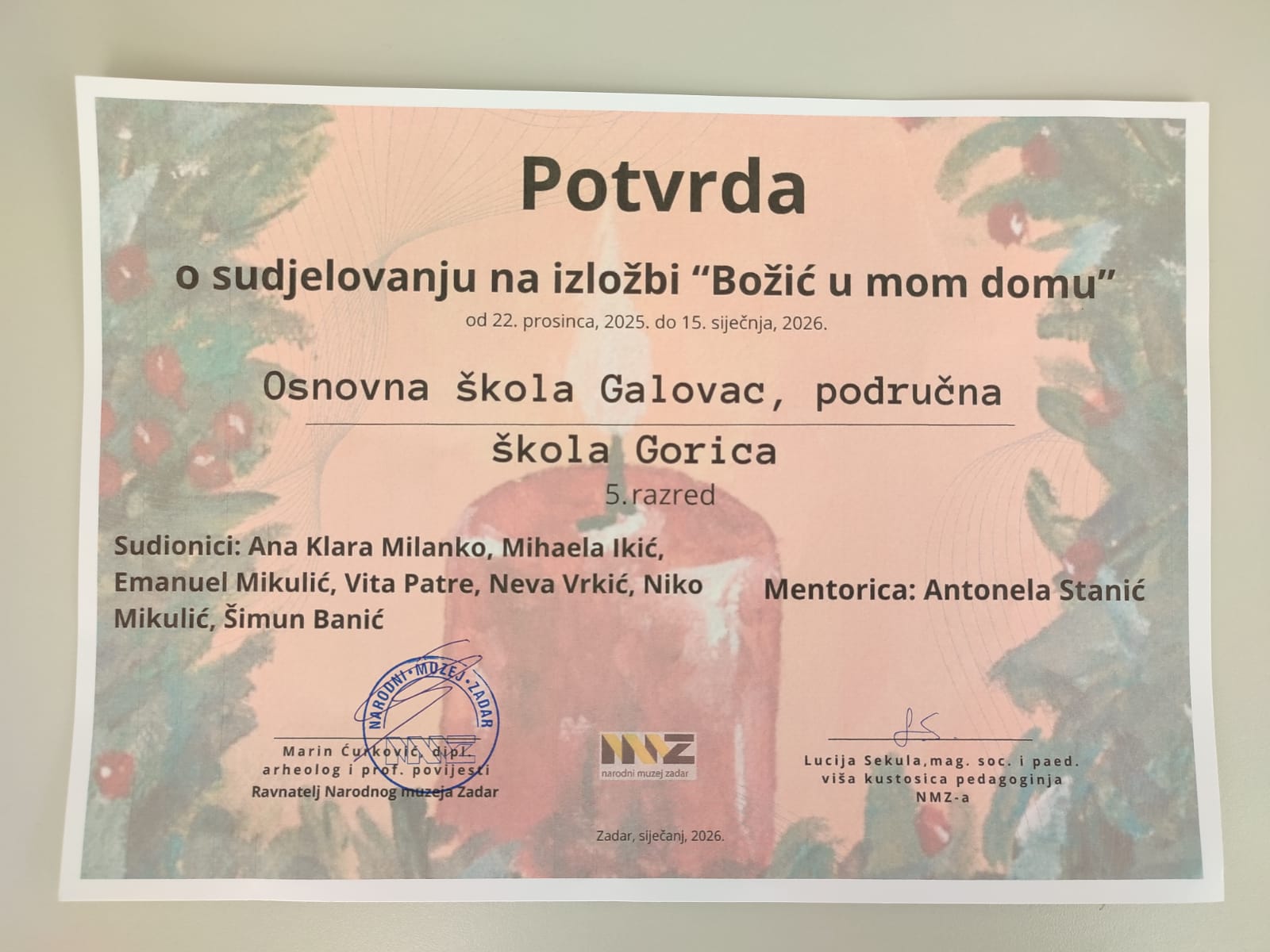 U Maloj izložbenoj dvorani Kneževe palače u organizaciji Pedagoško-andragoškog odjela Narodnog muzeja Zadar, otvorena je izložba “Božić u mom domu”.